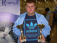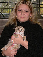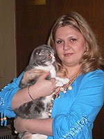 Новые хозяева о своих питомцах - Rumfold PoofyЗдравствуйте! Нас зовут Елена и Сергей Гуторенко, живем мы в городе Железнодорожный Московской области, по образованию - юристы. В начале 2006 года мы решили завести котенка. Долго думать о том, какой породы должен быть наш пушистый малыш, нам не пришлось, так как однажды прогуливаясь по Старому Арбату, мы увидели чудесных малышей породы скоттиш-фолд. Забавное выражение мордочки, огромные детские глаза, малюсенькие ушки нас поразили с первой минуты и навсегда. Итак, в субботнее утро мы отправились на поиски. Выставка кошек Nica Feline Center проходила в городе Реутов Московской области. Мы долго кружили на машине по Реутову, не могли найти нужный нам адрес. Проезжая мимо дома культуры и увидев милую девушку, выходящую из своей машины, спросили у нее, не здесь ли проходит выставка кошек. Оказалось, что это нужный нам адрес. Здесь было много шикарных представителей семейства кошачьих: и персидские, и британские, и бенгальские, и сфинксы, и – на нашу радость, шотландские вислоухие! Одной из заводчиков шотландцев была именно та девушка, которая подсказала нам дорогу на выставку – Надежда Румянцева. Ее кошки нас очень порадовали своей красотой и было решено, что котенка будем приобретать только у нее. И вот, наконец, в июне мы поехали к Надежде выбирать своего малыша. Выбрали мы голубо-кремовую с белым кошечку Rumfold Francheska (домашняя кличка – Челси). Челси имела успех на выставках Содружество-2006 Royal Canin по системе МФА, Nica Feline Center-2007 по системам WCA и CFA, получила титул International Chempion. В июне 2007 года Челси подарила нам своих первых детишек. Семеро пушистых комочков родились и росли на наших глазах, каждый день радуя своими успехами и шалостями.