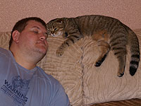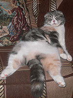 Однако на достигнутом мы решили не останавливаться и в апреле 2008 года к нам переехала на постоянное место жительства Надина кошка породы highland-fold Rumfold Poofy. Особенно полюбил нашу новую жительницу Самурай. Вот так мы и живем – два человека и три кошки. Но жить в таком составе осталось недолго. На днях наша Челси должна родить нам новых пушистиков, а там и Пуффи к концу лета отправиться за детишками!